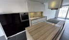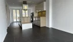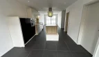 Die Wohnung besticht unter anderem durch die integrierte Deckenbeleuchtung sowie durch die durchgehend verlegten großformatigen, anthrazitfarbenen Fliesen.