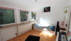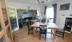 Der Grundriss der Wohnung im Obergeschoss ist identisch zu der im Erdgeschoss, jedoch ist die Wand zwischen Zimmer 1 und 2 entfernt worden. Die statisch notwendigen Holzbalken wurden belassen, wodurch ein großzügiger Wohn- und Essbereich mit Zugang zum Balkon entstanden ist. Vermutlich lassen sich bei Bedarf weitere Wände auf diese Weise öffnen.