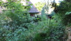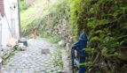 Hinter dem Haus liegt der gepflasterte Innenhof mit Wasserpumpe und darunterliegender Zisterne. Das grüne Hanggrundstück ist über einen schmalen Pfad erschlossen und bietet im oberen Bereich Ausblick auf die Nachbarhäuser sowie die darunterliegende grüne Ebene.
