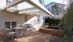 Der rückwärtige Teil des Grundstücks ist komplett mit Natursteinen belegt und dient als große, pflegeleichte Terrasse, die direkt von der Küche aus zugänglich ist. Durch die verglaste Überdachung mit textiler Verschattungsmöglichkeit ist eine weitestgehend wetterunabhängige Nutzung möglich. Der angelegte Teich unterstreicht die Idylle dieses schönen Außenbereichs.