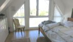 Über die großzügige Treppe gelangt man ins Obergeschoss, wo sich das Schlafzimmer mit vorgelagertem Ankleidezimmer befindet sowie ein Tageslichtbad mit Walk-In Dusche und Regenduschkopf, zwei Keramag Waschtische mit passenden Unterschränken, ein WC und ein Bidet. Eine Nische in der oberen Ebene kann z. B. als Arbeitsbereich genutzt werden.