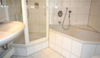 Das weiß geflieste Bad wurde modernisiert und mit einer Eckdusche,