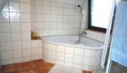 Vom Flur aus gelangen Sie über eine Holztreppe in das obere Geschoss, in dem das Badezimmer mit einer großen Eckbadewanne, Eckdusche und 2 Waschbecken untergebracht ist.