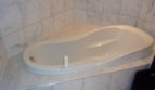 Die Sanitärausstattung besticht durch eine eingelassene moderne Badewanne und einer Dusche sowie einem Einbauschrank mit Waschbecken.