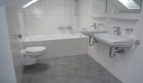 • Tageslichtbad mit Badewanne, zwei Waschbecken, WC, deckenhoch hell gefliest, großer Wandspiegel